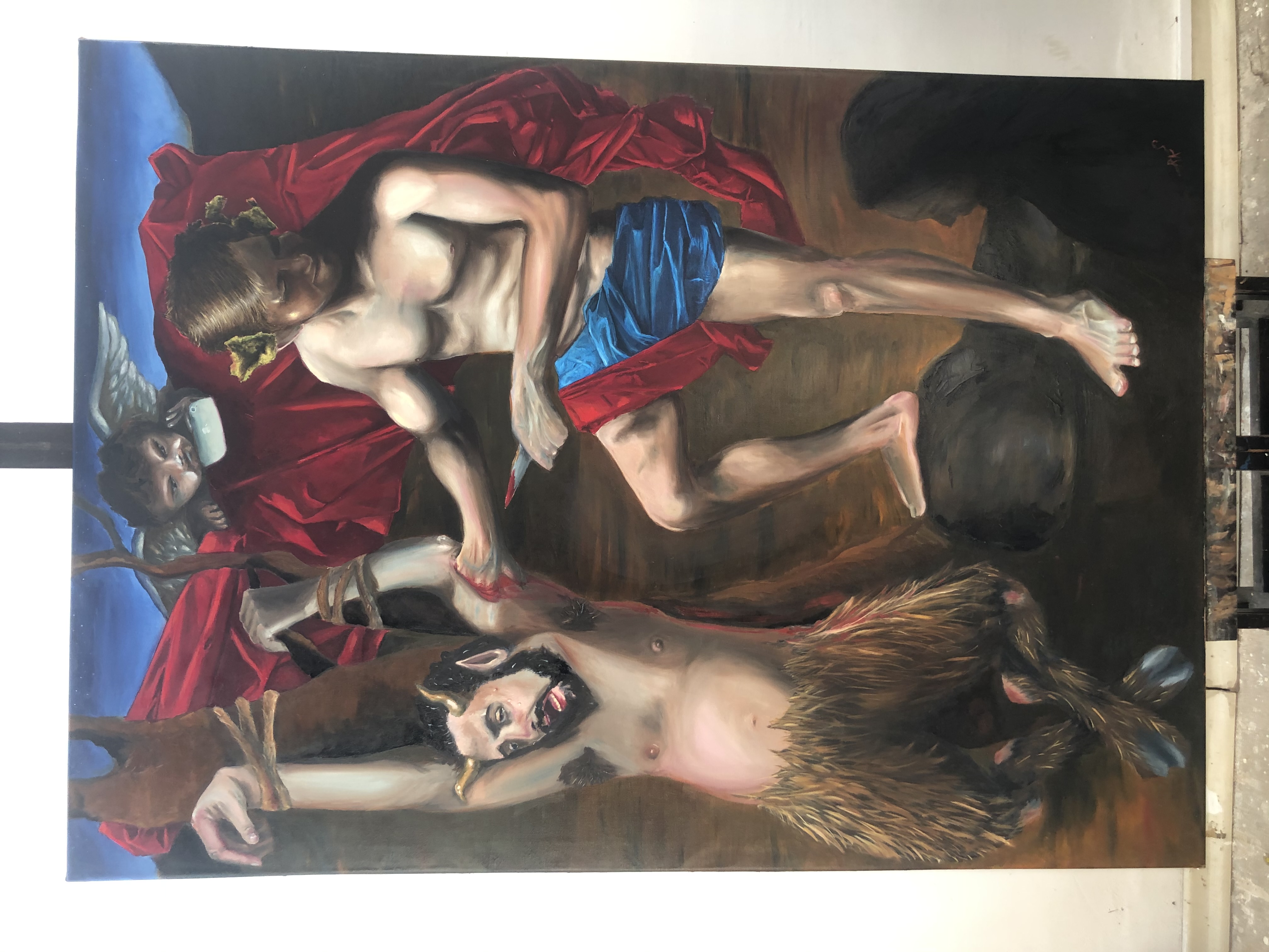 Esta obra reinterpreta el mito de Apolo y Marsias desde una perspectiva contemporánea. En la escena, un putti —figura clásica del imaginario barroco— registra la violencia con un iPhone, desplazando el testigo del mito hacia el presente. Durante la modernidad, la violencia tendió a ocultarse tras los márgenes de la representación pública; sin embargo, en la actualidad vuelve a circular y hacerse visible a través de teléfonos móviles, redes sociales y grupos de mensajería. Así, el mito se actualiza: aquello que antes pertenecía al relato simbólico reaparece hoy amplificado en el flujo constante de imágenes de nuestra era digital